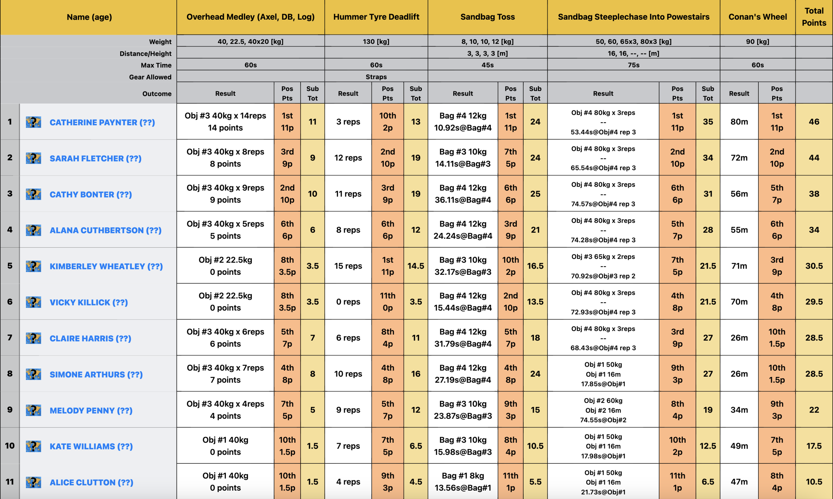 Women U75: Sandbags: 40/50kg > T-Pins: 50/65kg